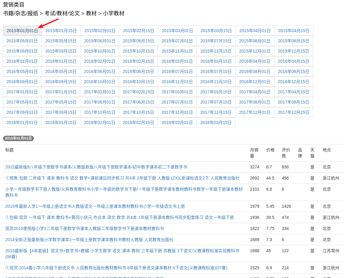营销类目是基于淘宝卖家中心类目进行营销调研,在此提供了2015年1月至2018年3月之间所有类目的历史存档数据,例如每月1号和15号的类目Top100商品榜。